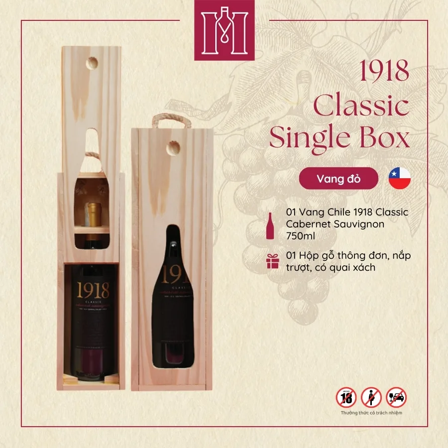 Combo 1 chai rượu vang đỏ Chile 1918 Classic Cabernet Sauvignon nhập khẩu chính hãng kèm hộp gỗ thông đơn, nắp đậy.