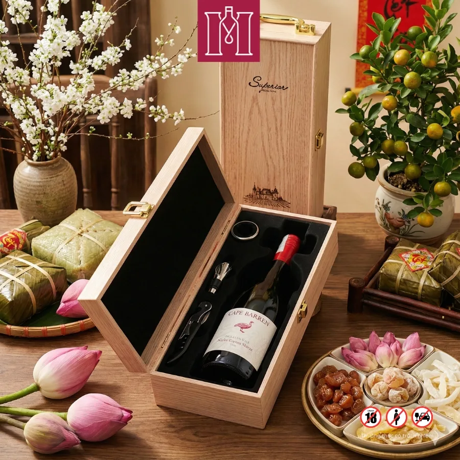 Combo quà tặng gồm rượu vang Úc Cape Barren McLaren Vale Native Goose Shiraz 14.5% (750ml) với hương vị đậm đà đặc trưng của giống nho Shiraz, cấu trúc tròn đầy và hậu vị kéo dài. Sản phẩm đi kèm hộp gỗ đơn nắp gập kèm phụ kiện sang trọng, là lựa chọn lý tưởng làm quà biếu cao cấp cho dịp lễ, Tết hoặc những sự kiện đặc biệt.